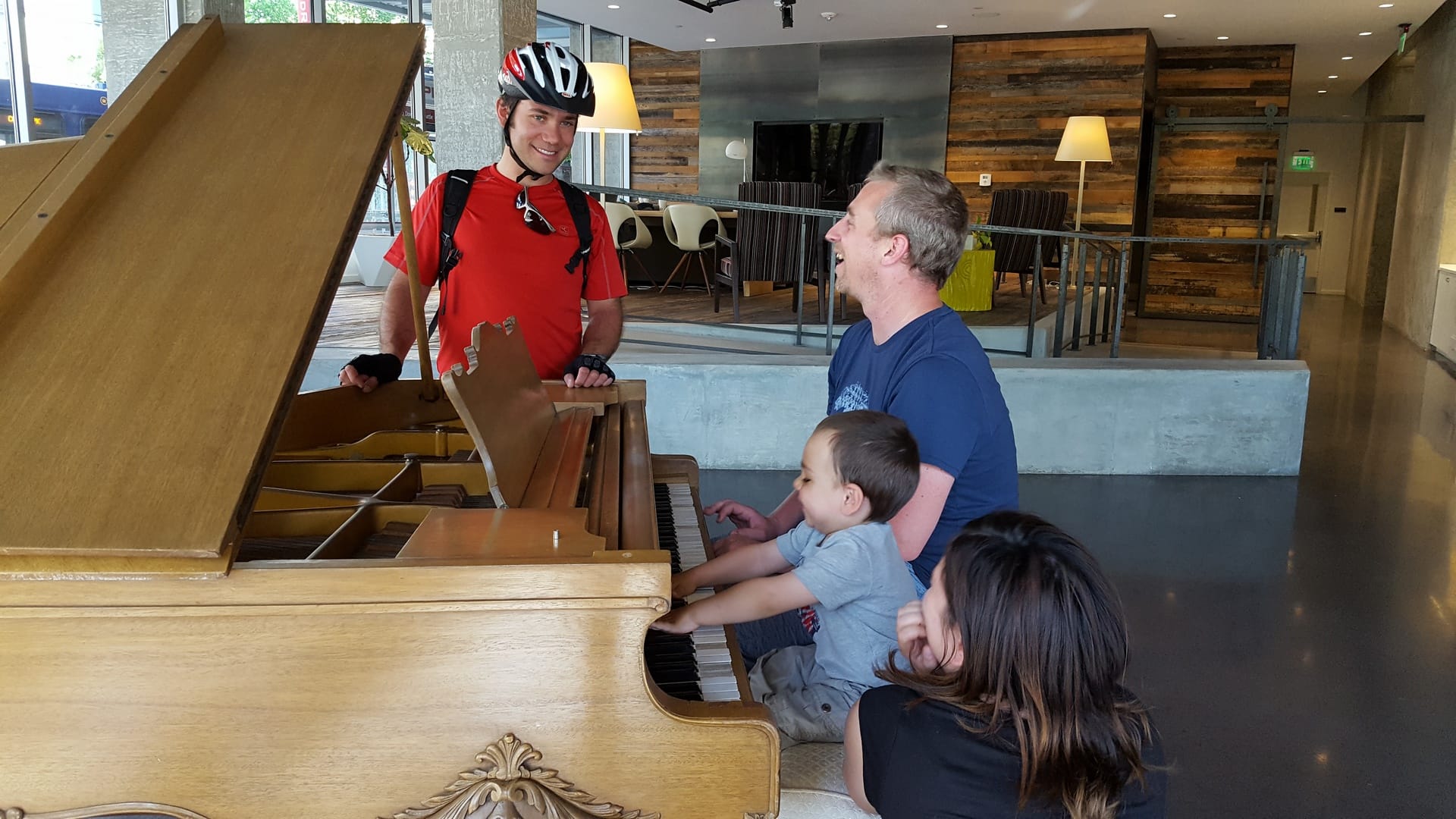Après ce bon repas et avant de repartir sur nos vélos, Oscar a découvert le piano. Il a adoré, mais bizarrement les personnes qui étaient dans le hall  de l’immeuble n’ont pas su percevoir son sens artistique !