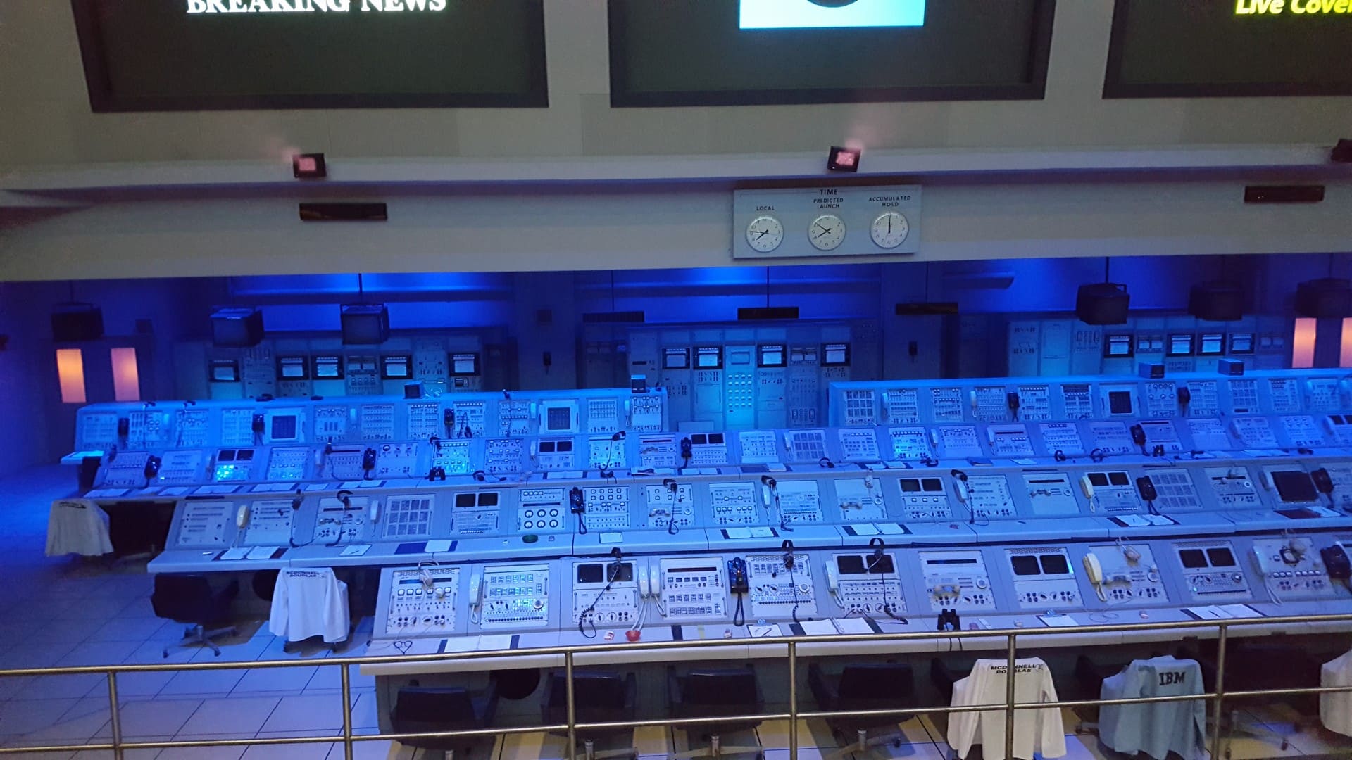 Après le tour de bus, nous retournons dans les différents bâtiments du musée et pouvons y découvrir la salle de contrôle (en l’état !) qui a été utilisée pour le lancement d’Apollo 11, première mission américaine à atterrir sur la lune en Juillet 1969.