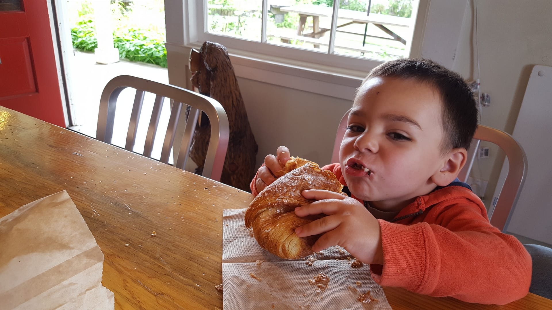 Dans ce village, nous découvrons une boulangerie – pâtisserie comme nous n’en avions pas encore vue ici ! Attention, on ne rigole pas, ce n’est pas une boulangerie américaine qui essaie de faire des croissants dont on parle ici : on parle d’une VRAIE boulangerie avec des VRAIS croissants et surtout pains au chocolat :