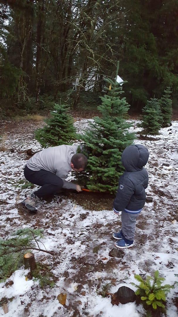 Ils fournissent même la scie, et heureusement parce que ce jour-là on n’avait pas apporté la nôtre. Même si le sapin n’était pas si grand, j’ai cru qu’on allait y passer des heures. Finalement le tronc était tout petit, et ça a pris à peine quelques minutes. J’ai presque failli manquer la photo :