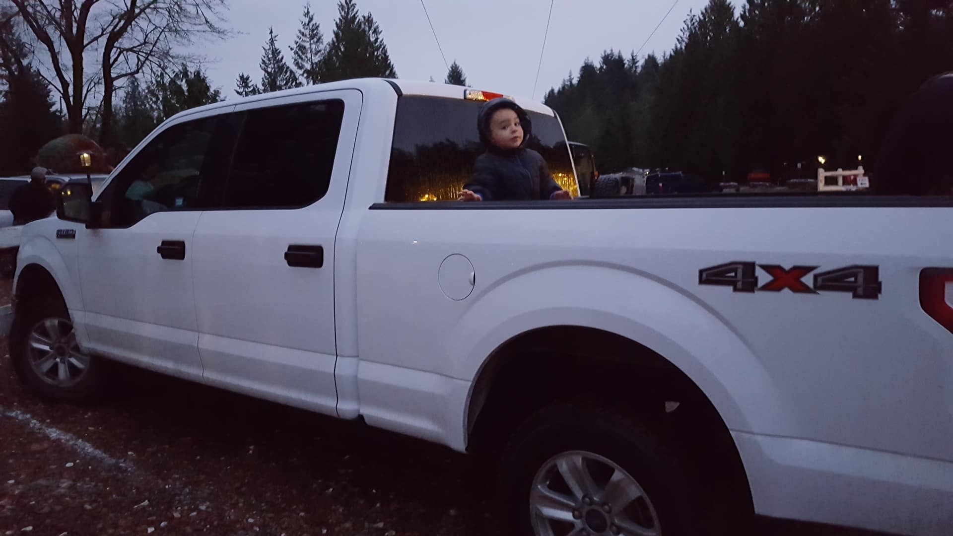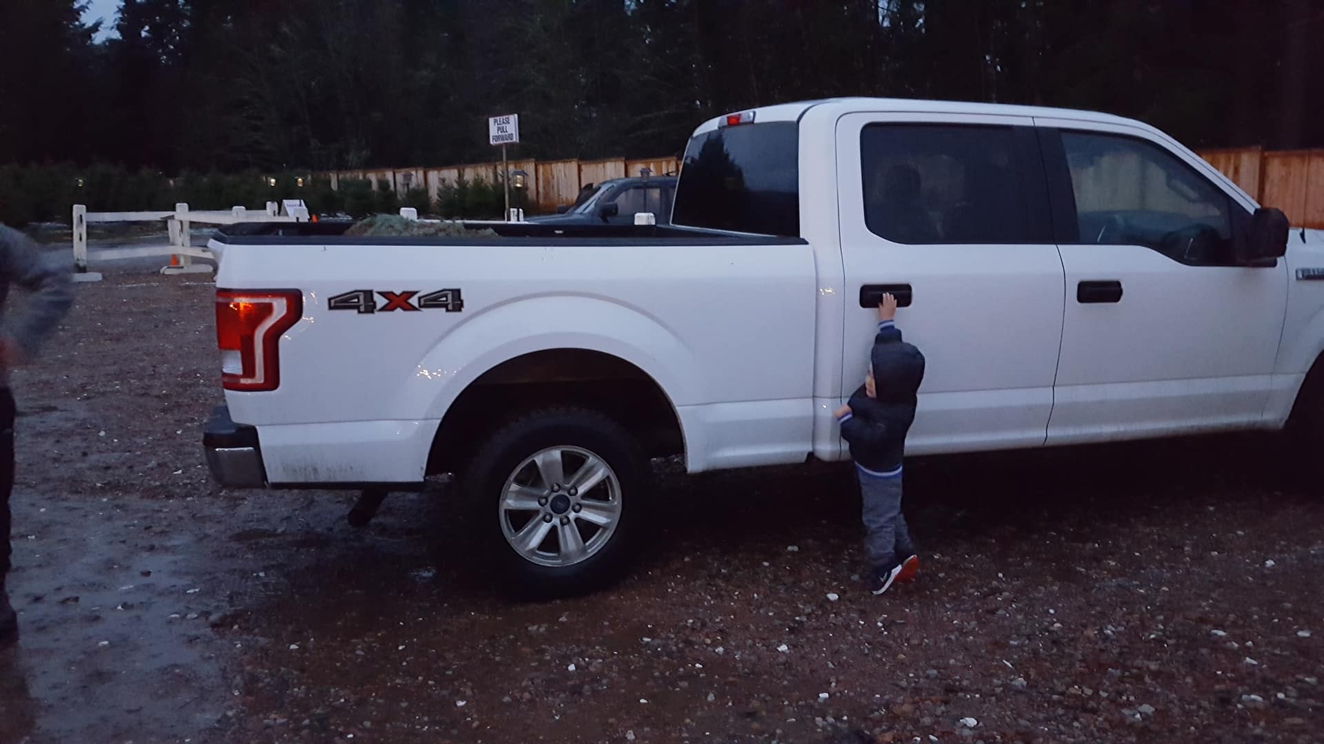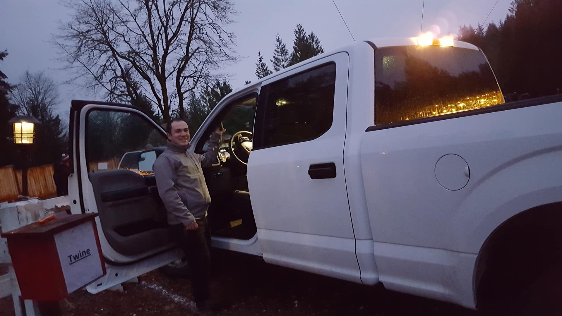 Une fois le sapin chargé, on monte en voiture pour rentrer à la maison. Le pick-up c’est bien, mais c’est haut quand même !
