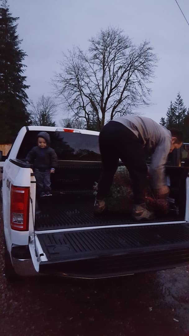 On charge donc le sapin dans le pick-up. Comme la benne est grande, il faut l’attacher pour ne pas le perdre en route.