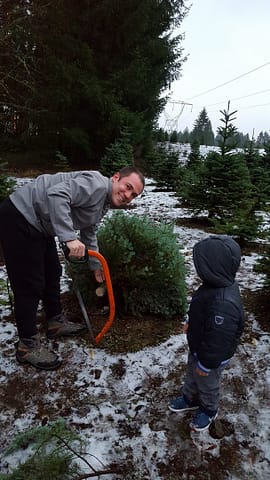 Ils fournissent même la scie, et heureusement parce que ce jour-là on n’avait pas apporté la nôtre. Même si le sapin n’était pas si grand, j’ai cru qu’on allait y passer des heures. Finalement le tronc était tout petit, et ça a pris à peine quelques minutes. J’ai presque failli manquer la photo :