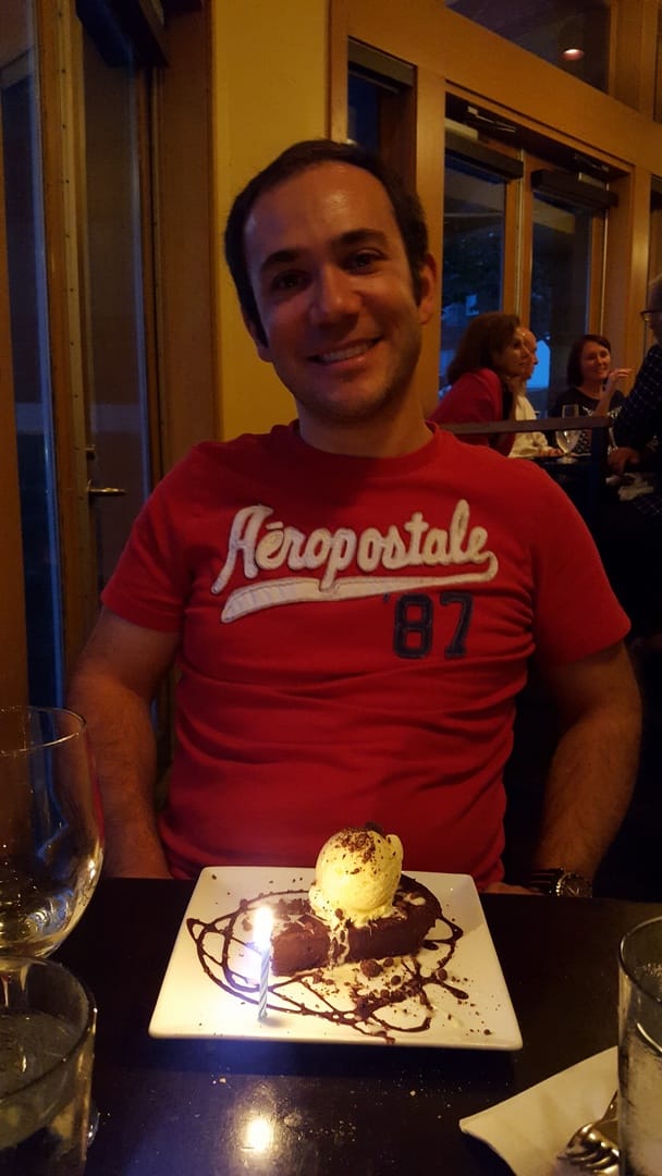 Comme c’est l’anniversaire de Rodolphe, il a droit à un dessert offert avec la bougie qui va bien !