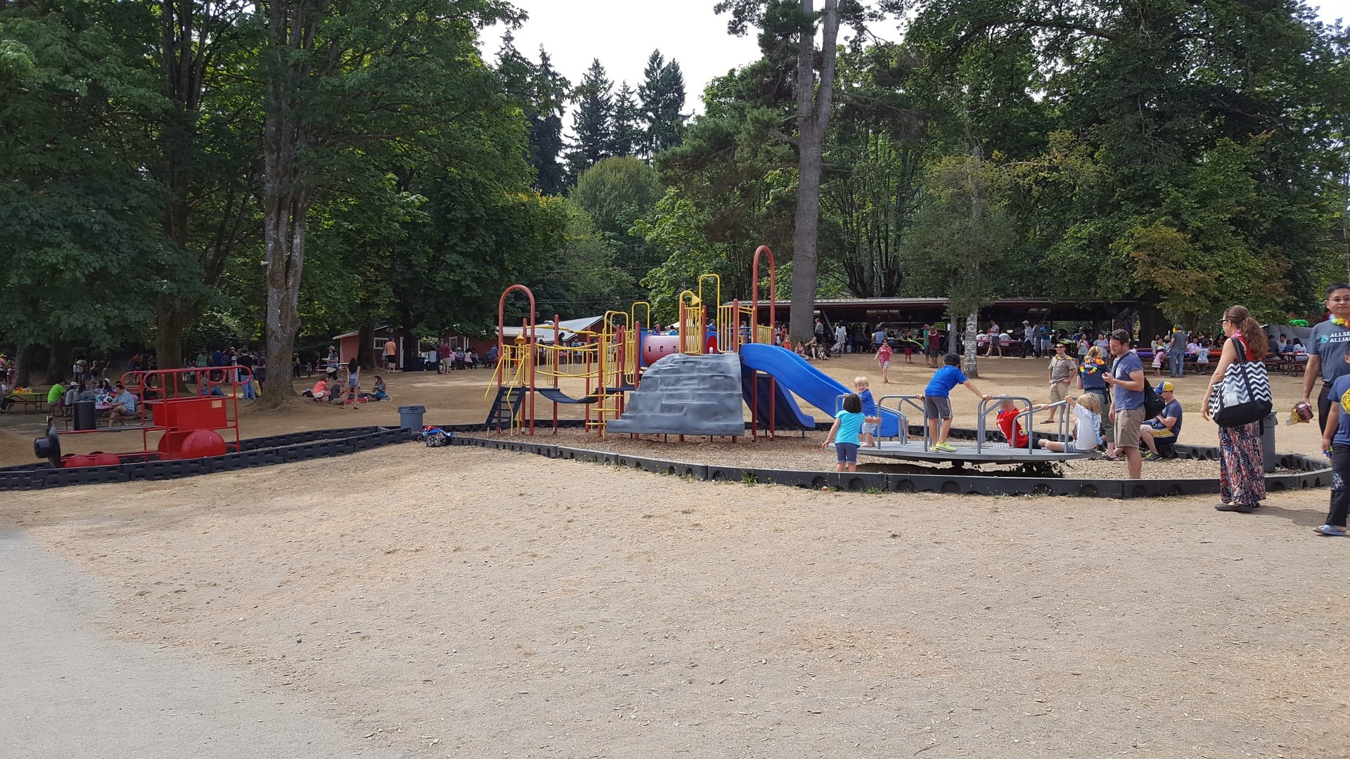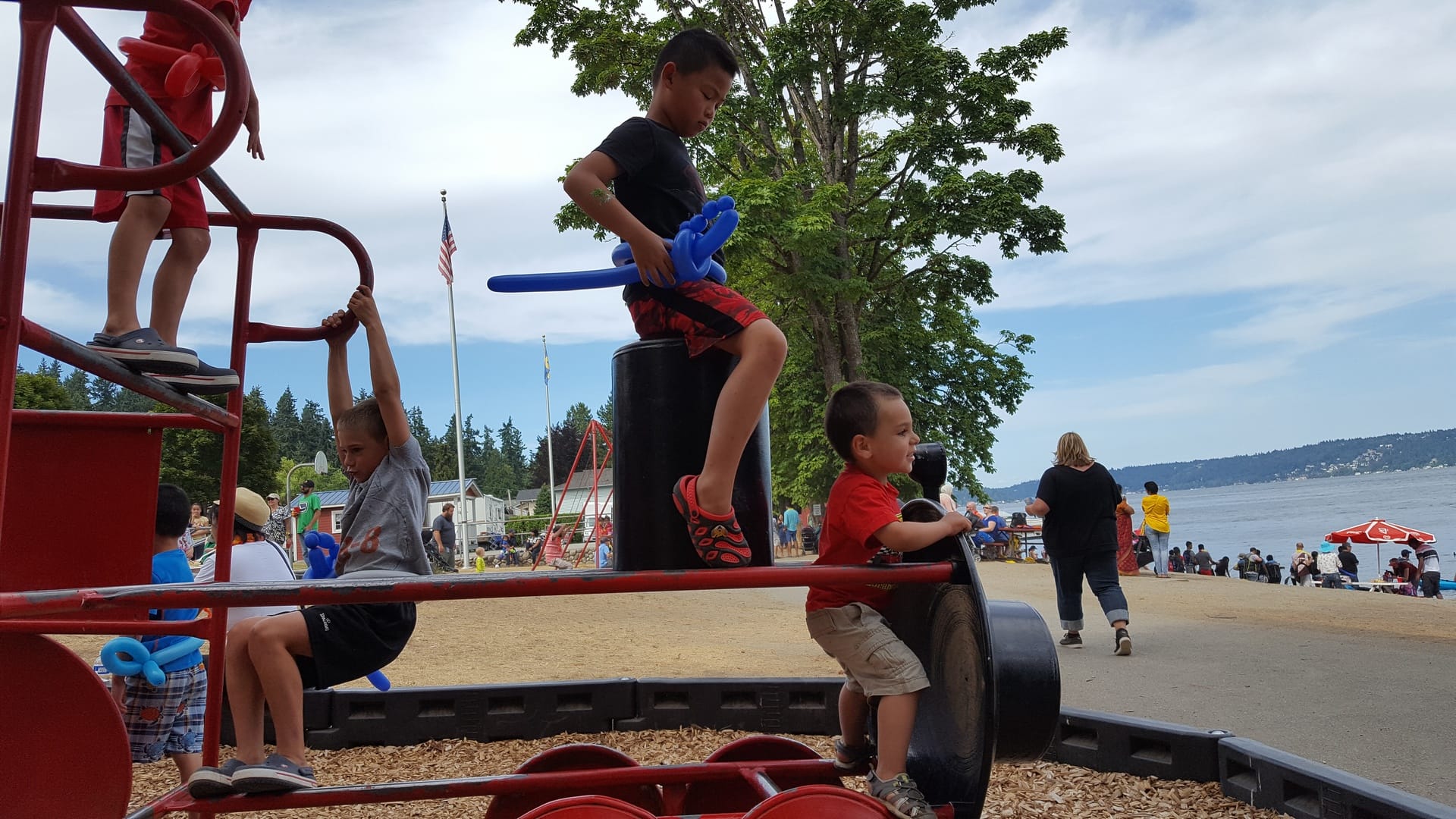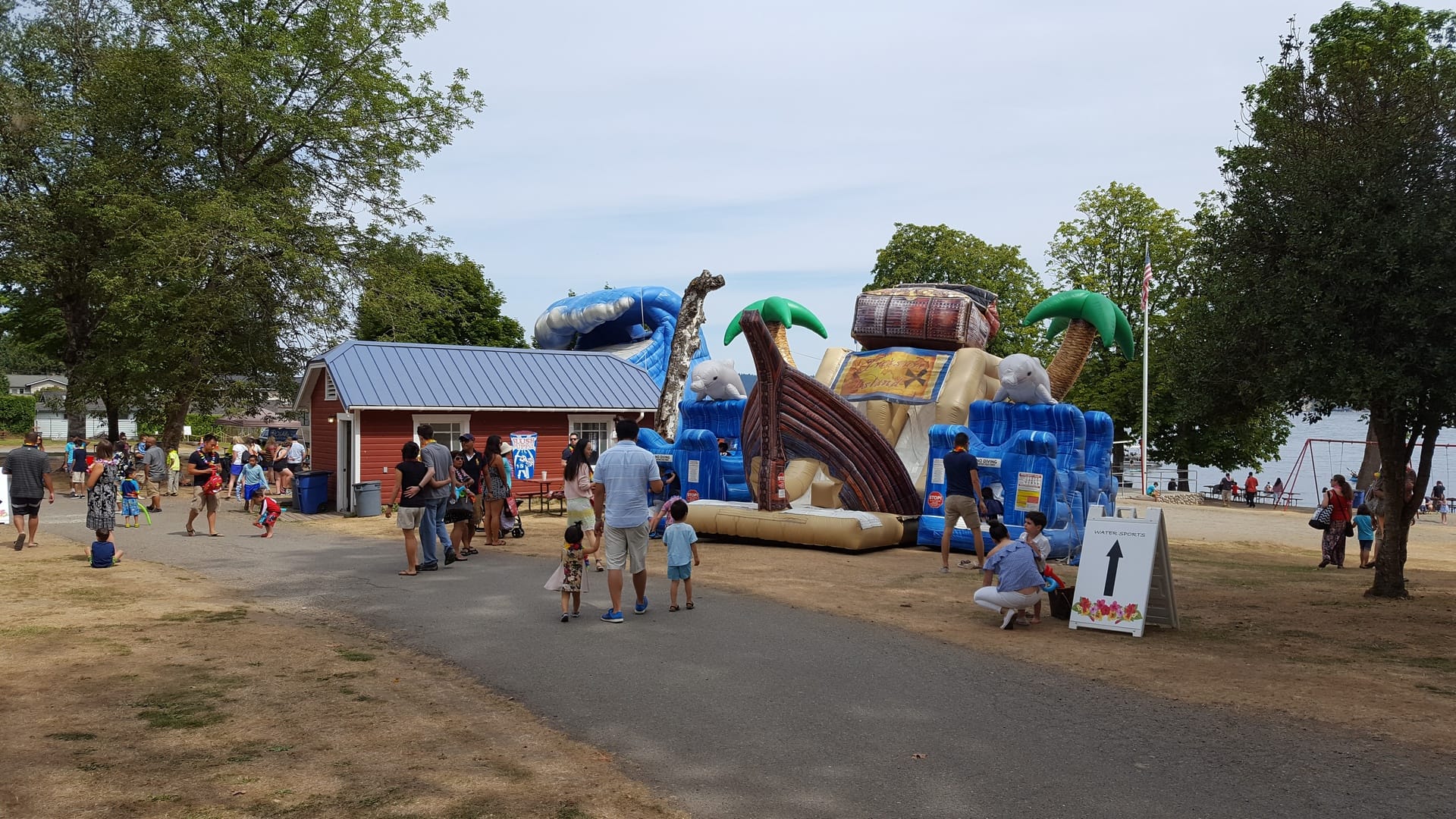 Le lendemain, nous allons au pique nique d’été organisé par Expedia. Cette année, pour l’occasion Expedia a privatisé un parc qui est au bord du lac Sammamish. Ils ont tout installé pour que tout le monde s’amuse, comme les châteaux gonflables :