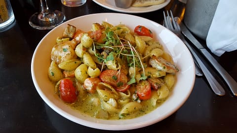 Ça y est, nous sommes déjà le 18 août ! Que le temps passe vite ! Ce soir, nous prenons Lucie pour garder Oscar, et nous allons nous faire un restaurant à Kirkland au bord du lac. Ce repas est délicieux : Rodophe choisit le saumon grillé, et je prend les pâtes aux fruits de mer et sauce pesto.