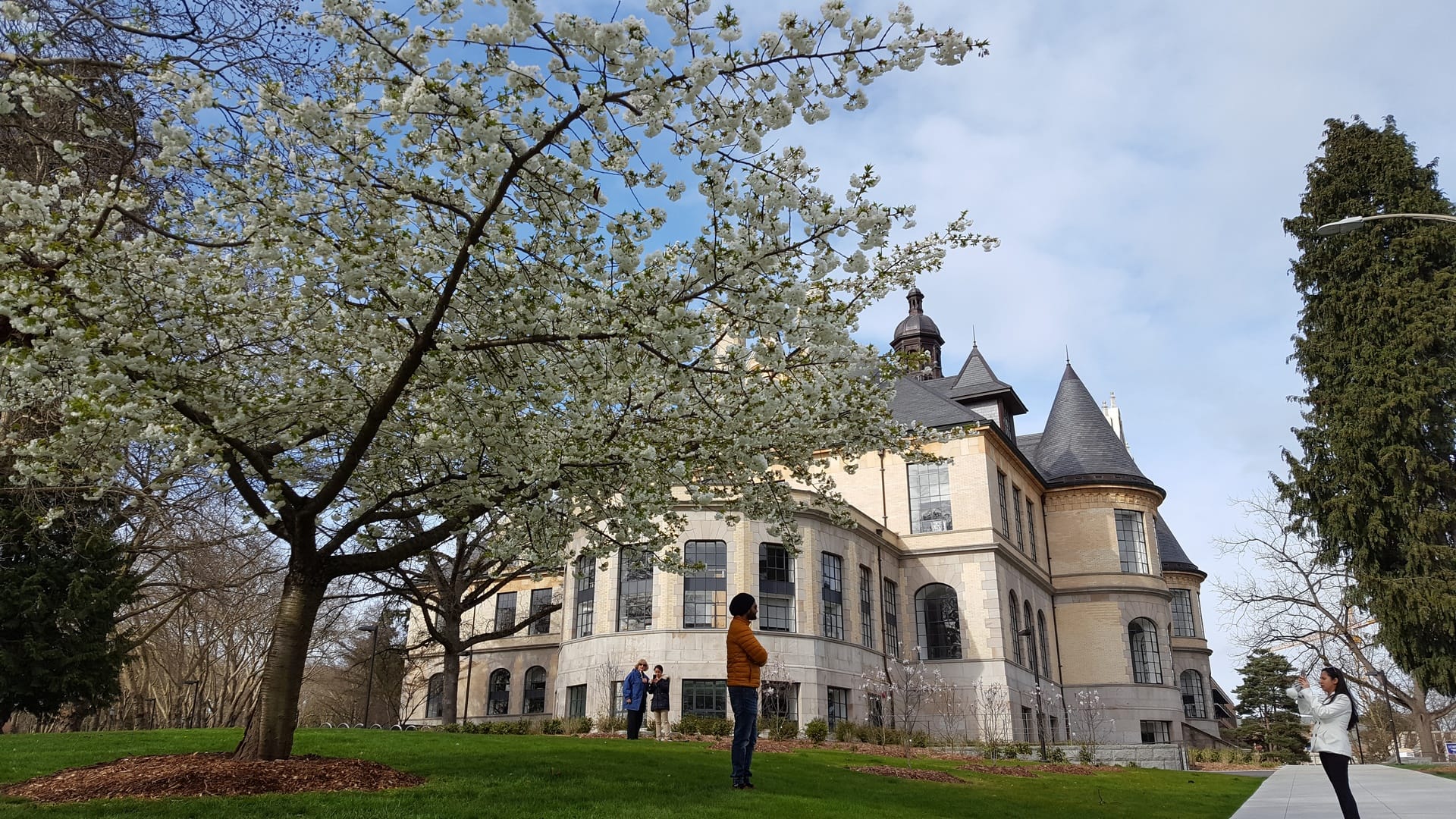 C’est à cette période de l’année, que l’on peut admirer ces cerisiers tous en fleurs. Et nous ne sommes pas les seuls à nous être déplacés car avec les bâtiments universitaires, c’est vrai que c’est très beau…