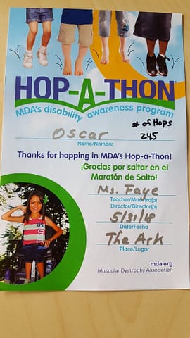 Commençons par les activités d’Oscar à l’école. Comme l’an dernier, pour ouvrir les enfants à la différence et les sensibiliser au handicap, Oscar participe au « hop a thon ». Il va faire le plus de bons possibles en quelques minutes pour soutenir les enfants atteint d’un syndrome d’atrophie musculaire.