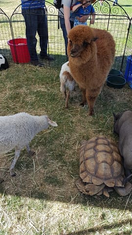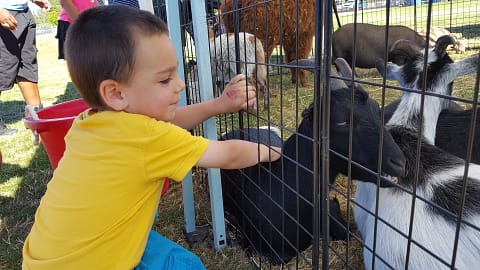 Dan un petit enclos, on y trouve un lama, des chèvres, une tortue, un cochon et des moutons. Oscar apprécie de caresser les petites chèvres :