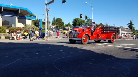Ensuite, direction l’artère principale de la ville pour voir la parade. Celle-ci commence avec le camion de pompier version “antique” ! Vous noterez que le conducteur est à peu près de la même époque que le camion.