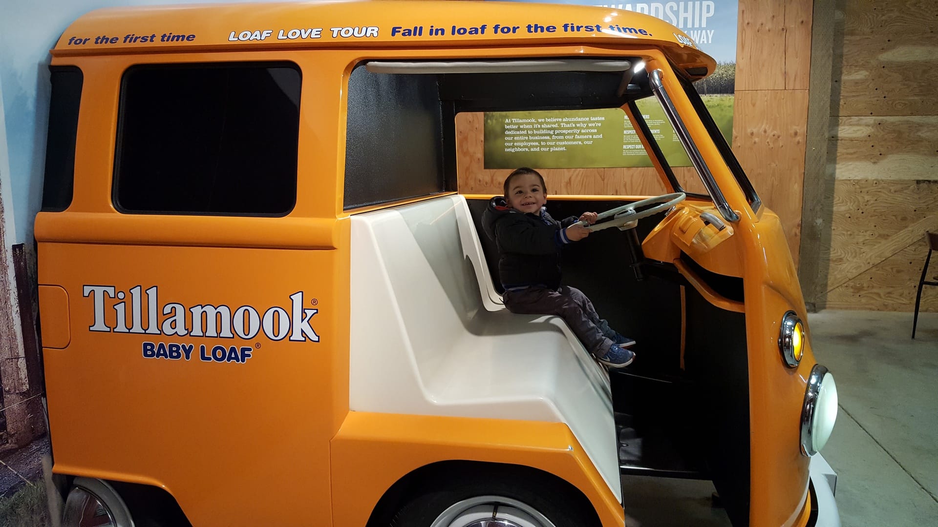 Oscar se passionne pour tous les moyens de transport. Si le train en fait bien entendu partie, sa passion numéro un reste le camion de pompier. Mais il était tout de même content d’expérimenter le minibus de l’usine de fromage de Tillamook :