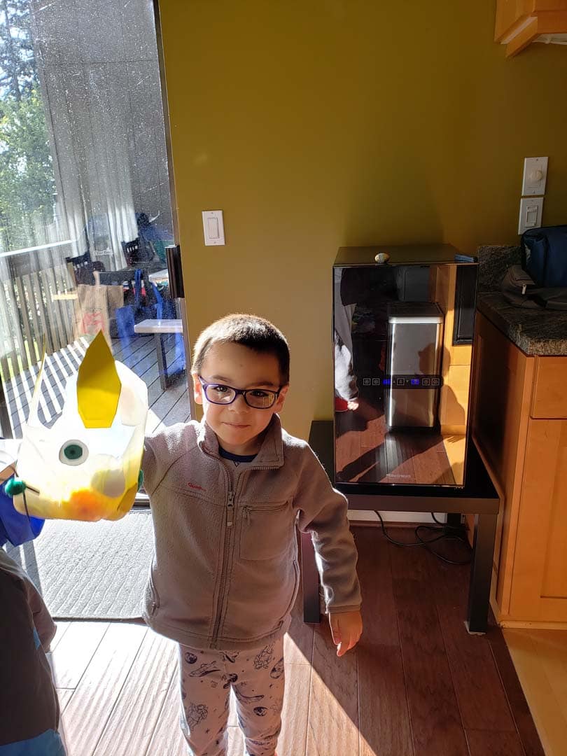 Avec tout ça, le mois d’avril passe à une vitesse… Pâques pointe déjà le bout de son nez. Oscar a fabriqué à l’école, un « panier » pour récupérer son trésor de guerre.