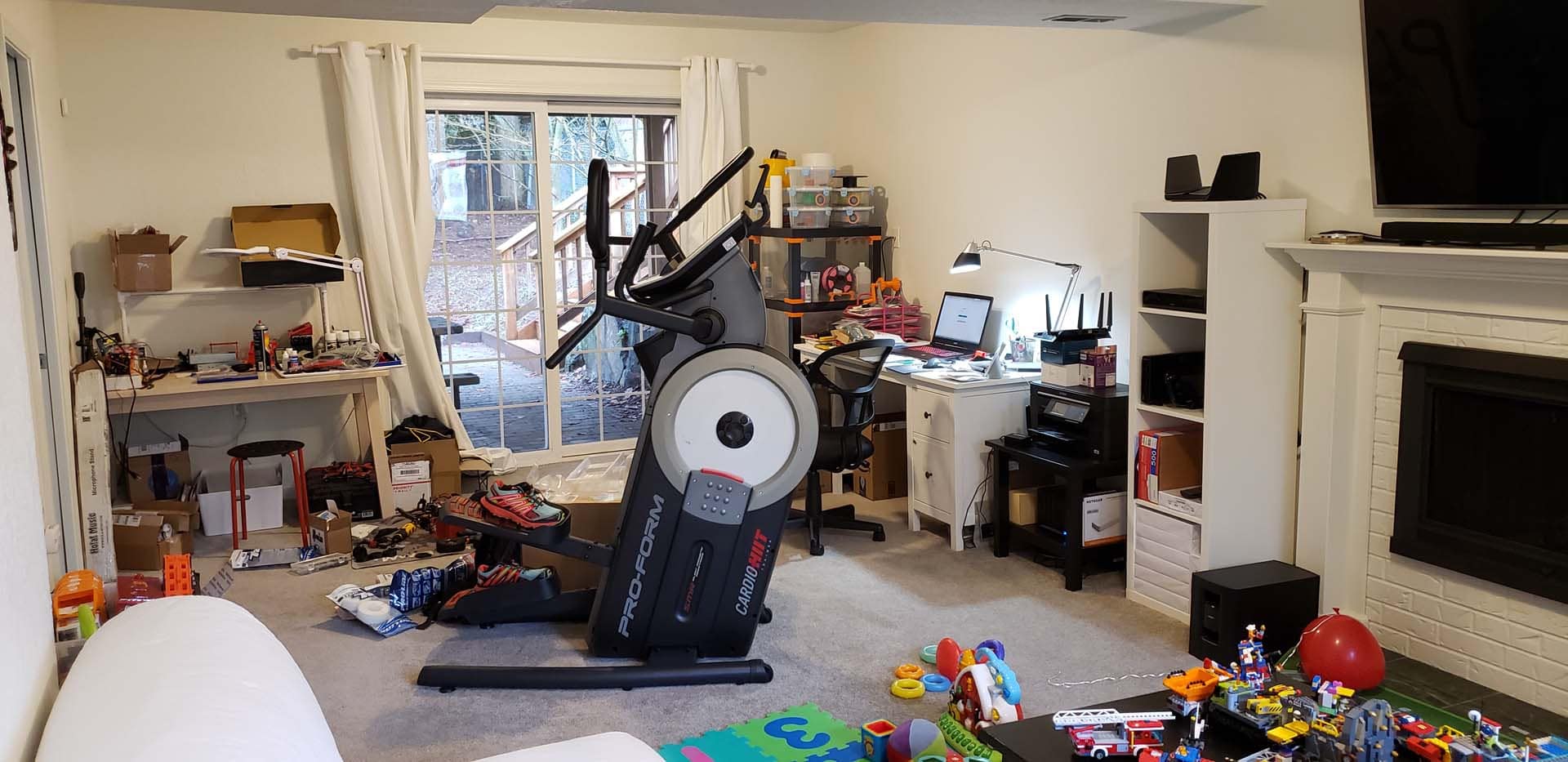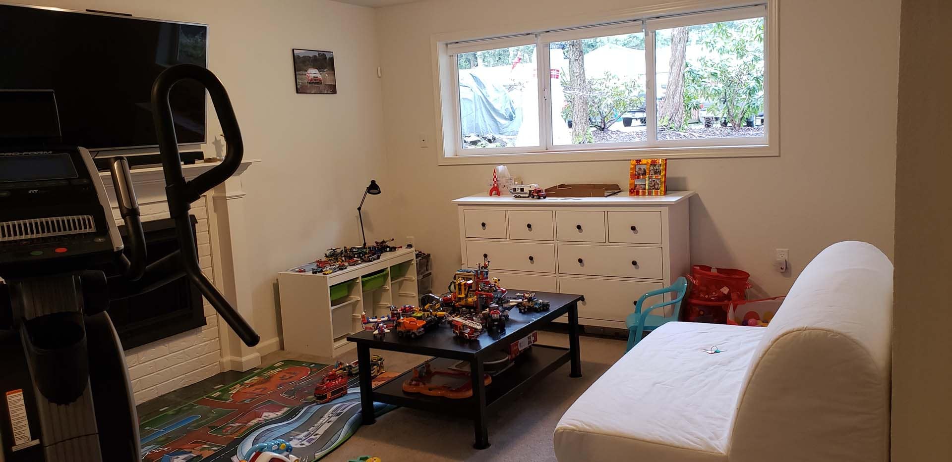 Cette pièce fait office de salle de jeu, bureau et salle de sport (pour toute la famille donc !).