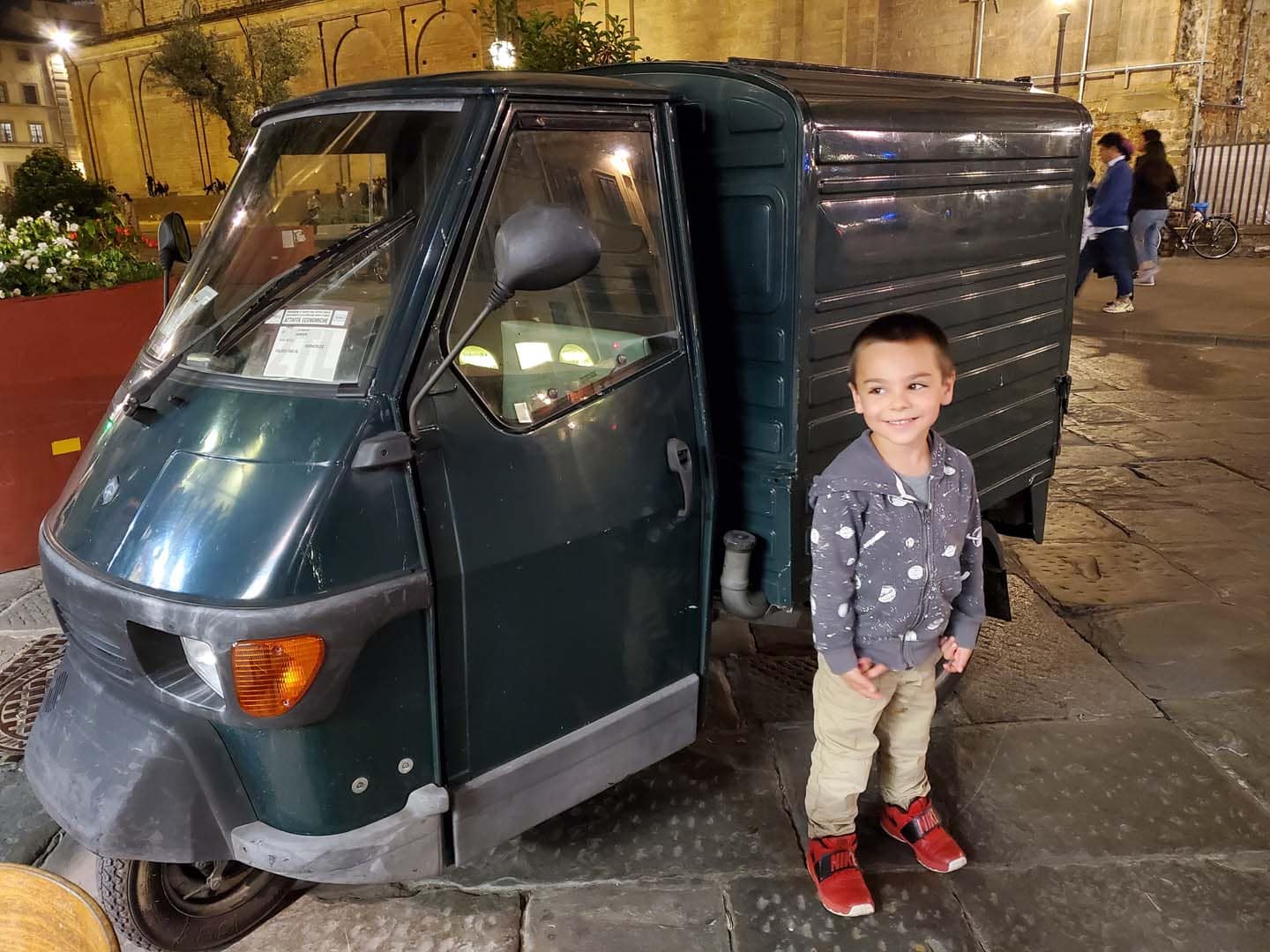 Le fameux petit camion à 3 roues, typique de l’Italie !! Oscar est ravi…