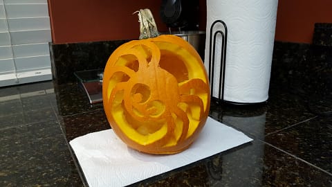 Cette année on a essayé de faire mieux que l’an dernier et de ne pas se limiter à la citrouille sculptée ! Ici Halloween n’est pas qu’une tradition c’est un concours : il faut être celui qui a la maison la plus décorée. Nous avons donc commencé par faire notre citrouille (quand même) :