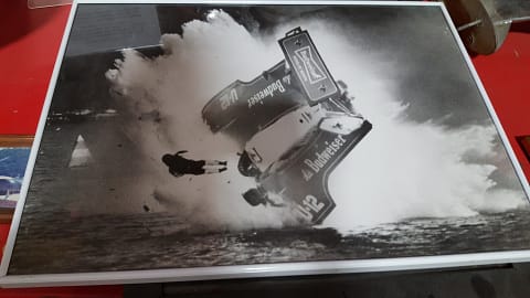 Toute la puissance est là : une turbine, et une coque de bateau qui laisse passer l’air de façon à pouvoir soulever le bateau à pleine vitesse. C’est aussi ce design qui rend ce sport si dangereux, car lorsque le bateau “vole”, le moindre coup de vent peut le retourner en seulement quelques secondes.