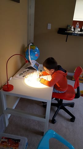 Comme Oscar a maintenant 4 ans, nous avons un peu renouvelé son espace de jeu à la maison. On voit ses goûts changés et s’affirmés. Pour l’occasion, et comme il aime apprendre et dessiner, nous lui avons pris son premier bureau !