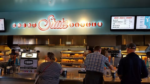Avant d’aller s’asseoir à nos places, on prend donc le dîner. Un petit burger avec bien entendu la bière du stade !
