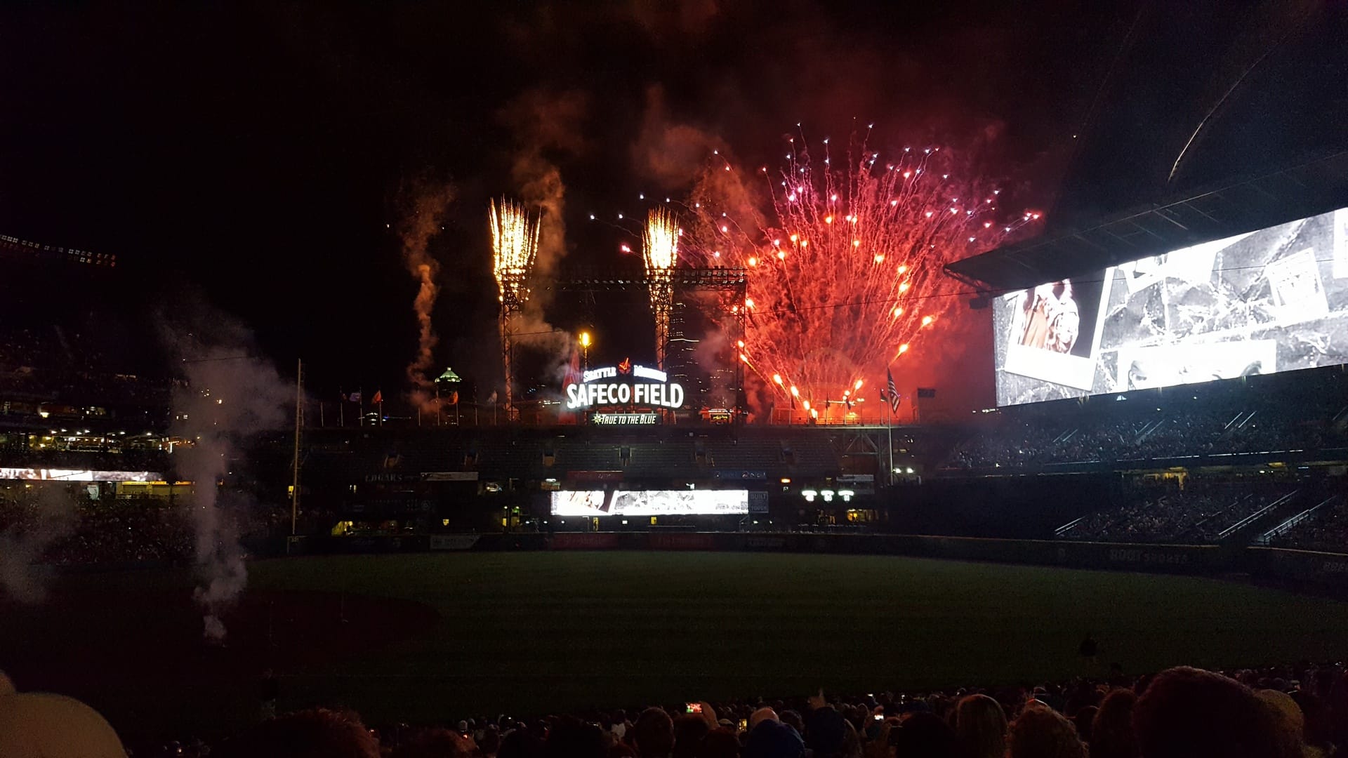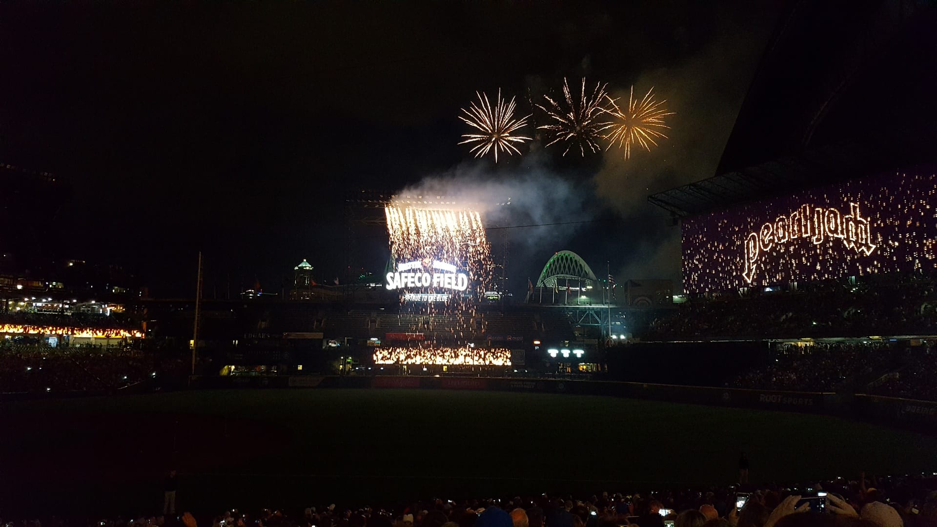Pendant l’été certains matchs se terminent avec un feu d’artifice en musique. Ce soir le spectacle est rythmé par le son de Pearl Jam, un groupe de rock originaire de Seattle formé en 1990.
