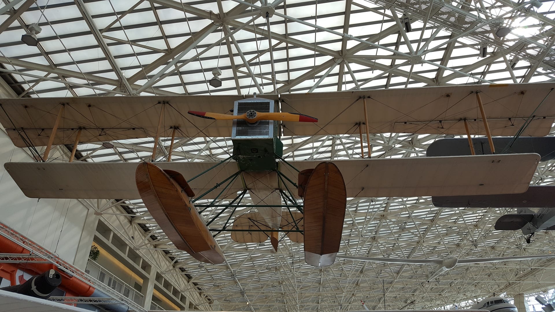Après avoir fini notre petit tour à l’extérieur nous allons visité l’intérieur. La première partie de l’exposition retrace l’histoire de l’aviation, avec l’un des tous premiers avions à moteur, datant du début des années 1900 :