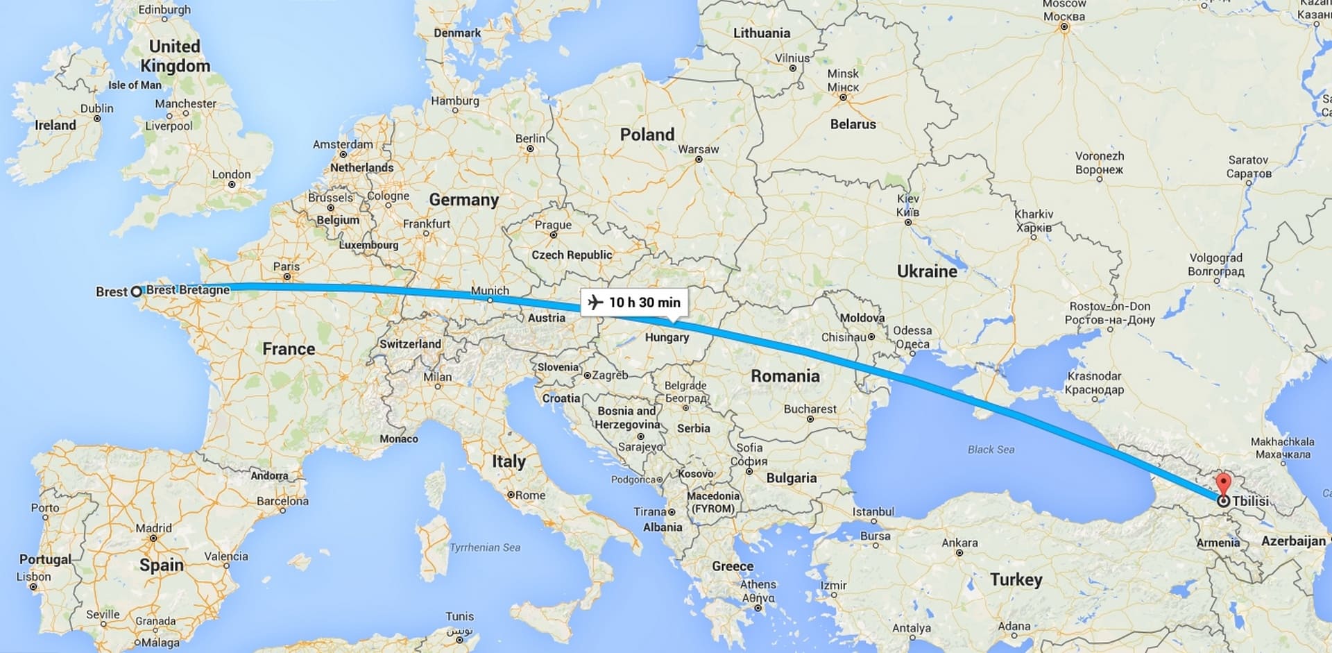 A titre de comparaison, si on devait parcourir 4600 km depuis Brest, ceci nous mènerait tout droit au delà de la Mer Noire, à Tbilissi, capitale de la Géorgie !