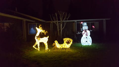 Oui d’accord on s’est un peu lâché !! Mais c’est comme ça ici. Quand je cherche un terme pour décrire les Américains, je crois que ce qui leur correspond le mieux c’est “à fond, sans peur et sans honte” ! L’an prochain on aura encore plus de décorations extérieures car après Noël il y a genre 50% de remise ou plus sur tous ces articles, donc on a racheté d’autres accessoires à ce moment là !