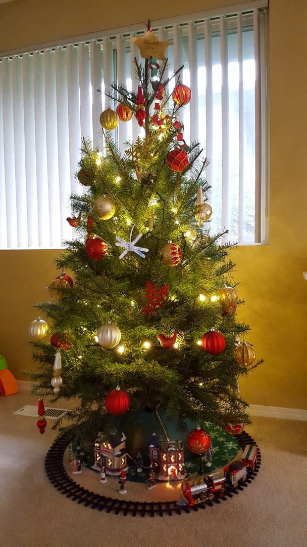 On commence par l’intérieur, nous installons aux pieds de notre sapin un petit village, avec le petit train électrique qui tourne autour !