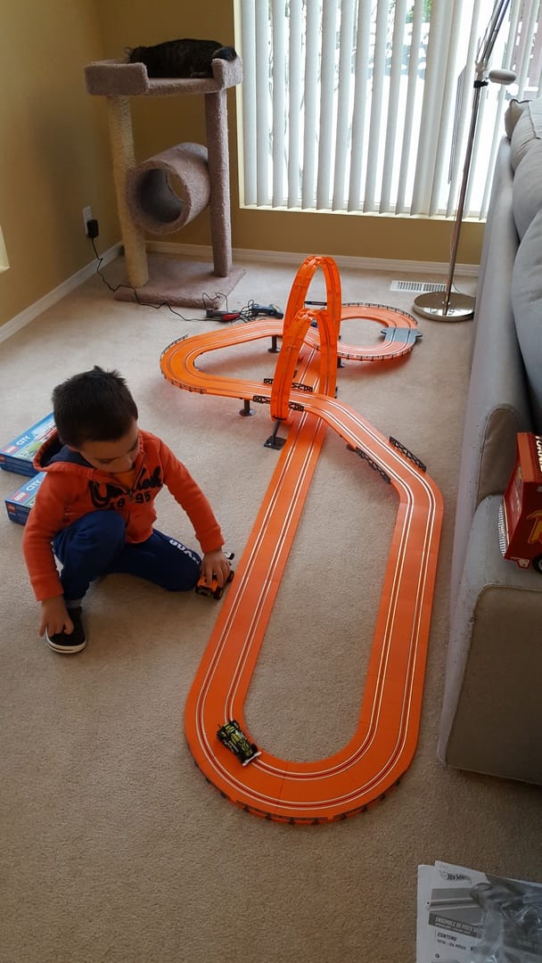 Mais avant de jouer avec tout ces jouets, c’est le circuit de voitures qui a retenu toute son attention (et celle de papa aussi !) :