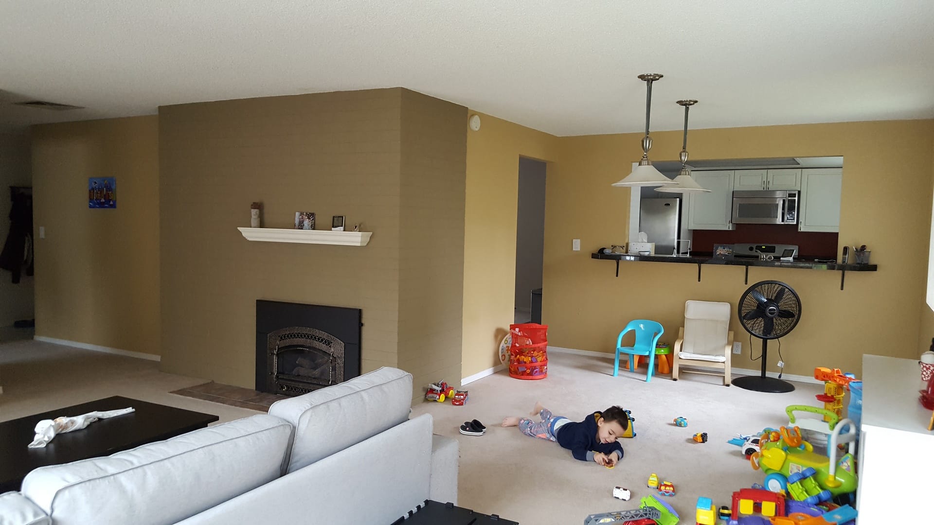 La cuisine est ouverte sur le salon, et l’espace de jeu que nous avons installé pour Oscar.