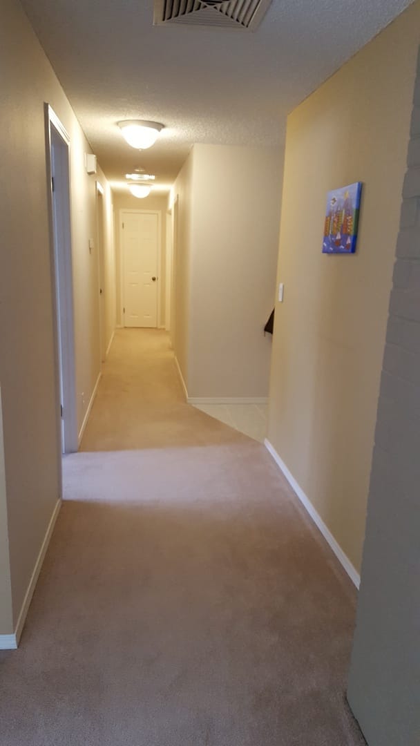 La pièce donne sur un long couloir qui dessert les chambres et les salles de bain.