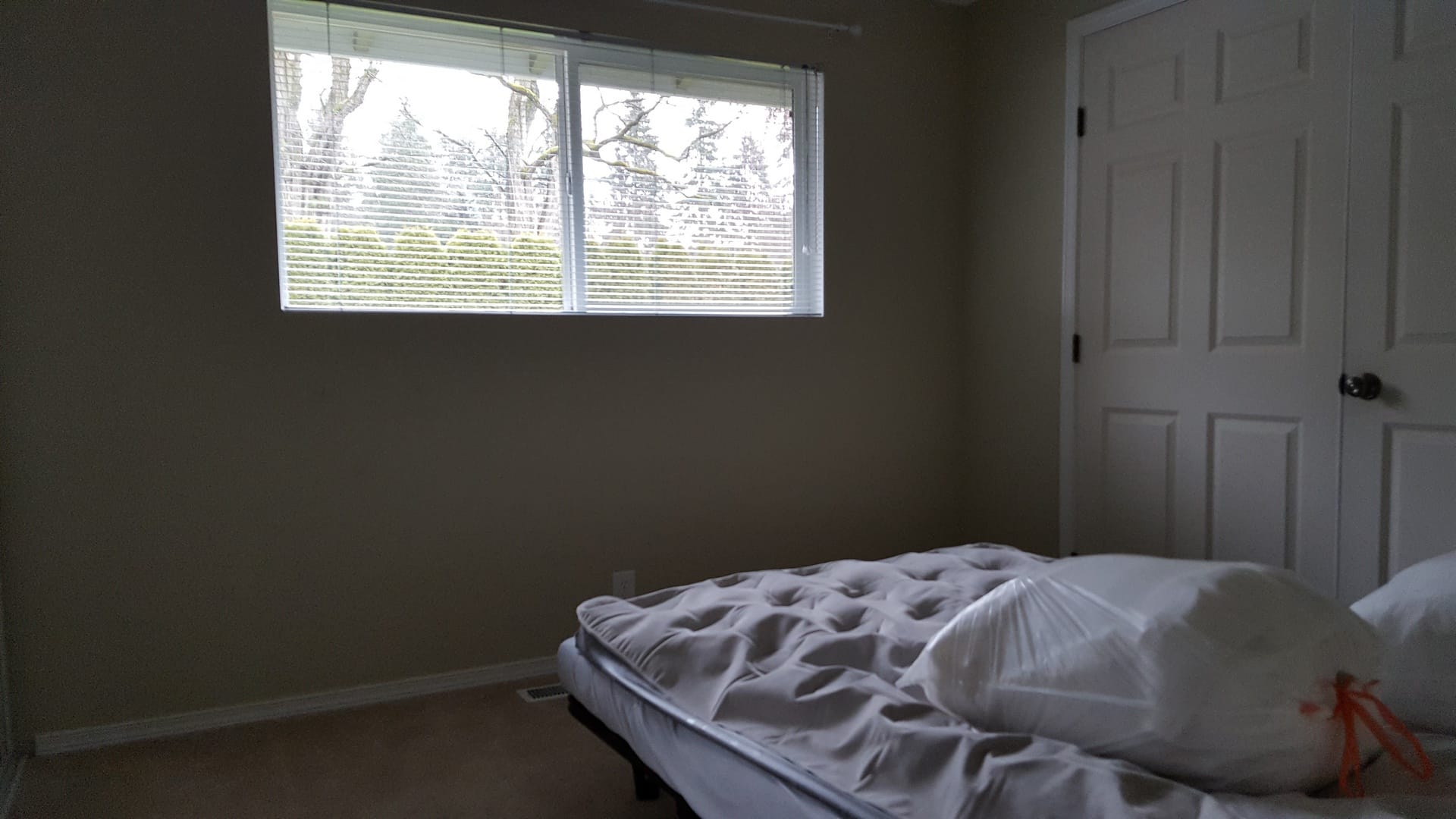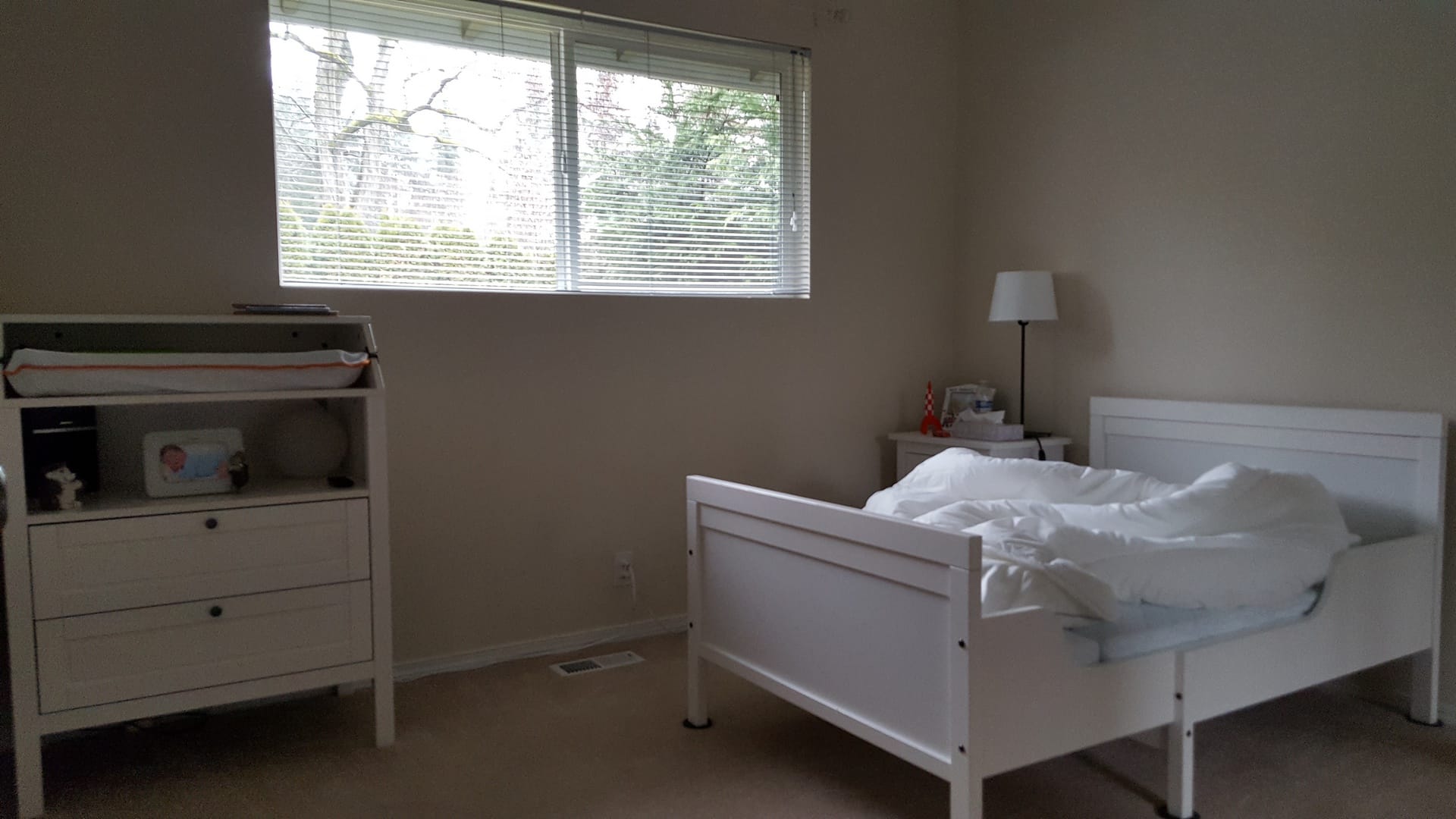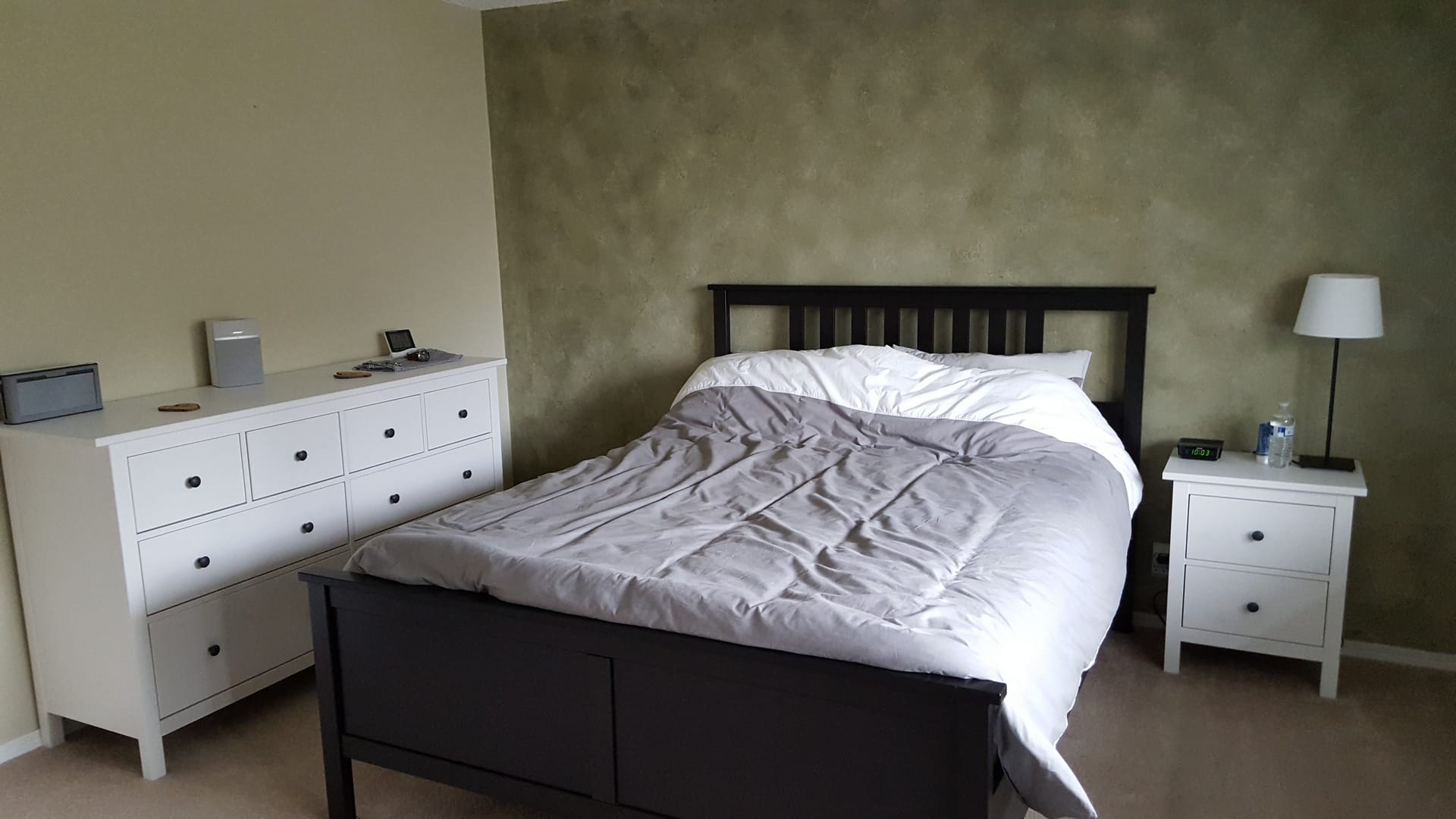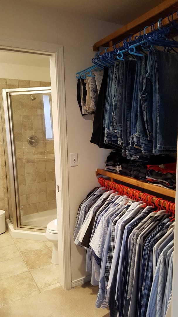 Notre chambre, qui comme toutes les “master bedroom” a son dressing et sa salle de bain. Dans cette maison, le dressing est un “couloir” qui donne sur la salle de bain :