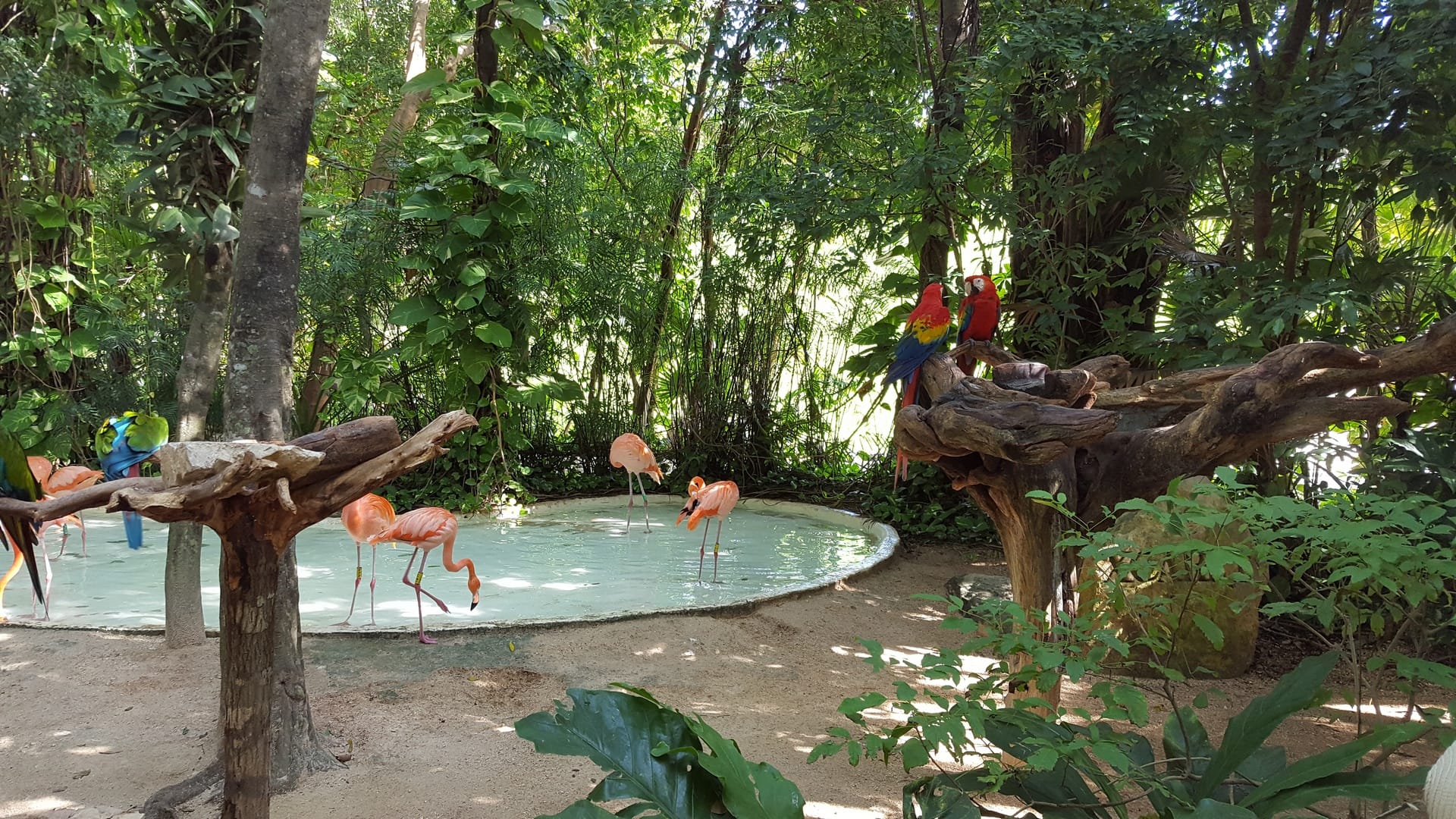 Dès l’entrée du parc nous sommes accueillis par des perroquets et flamants roses :
