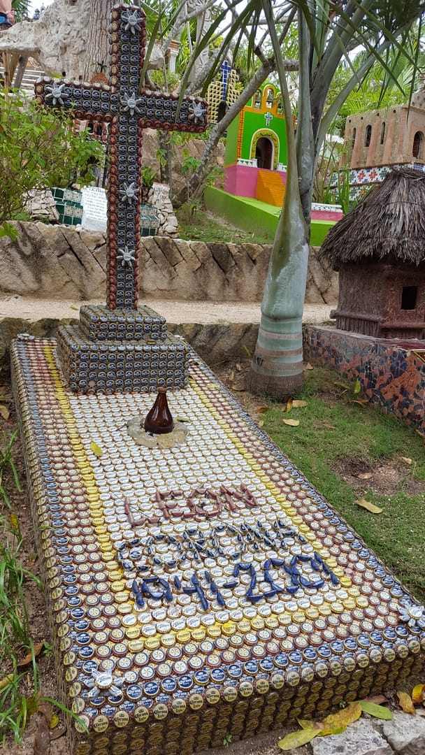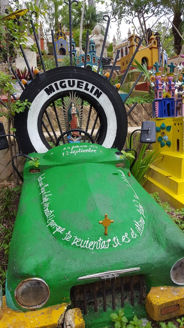 Nous terminons la visite sur un village mexicain plus récent, et surtout par le cimetière (quel bel enchaînement avec le jeu de balle Maya !), où les habitants rivalisent de créativité pour décorer les tombes. Ici la famille Miguelin (Michelin) :