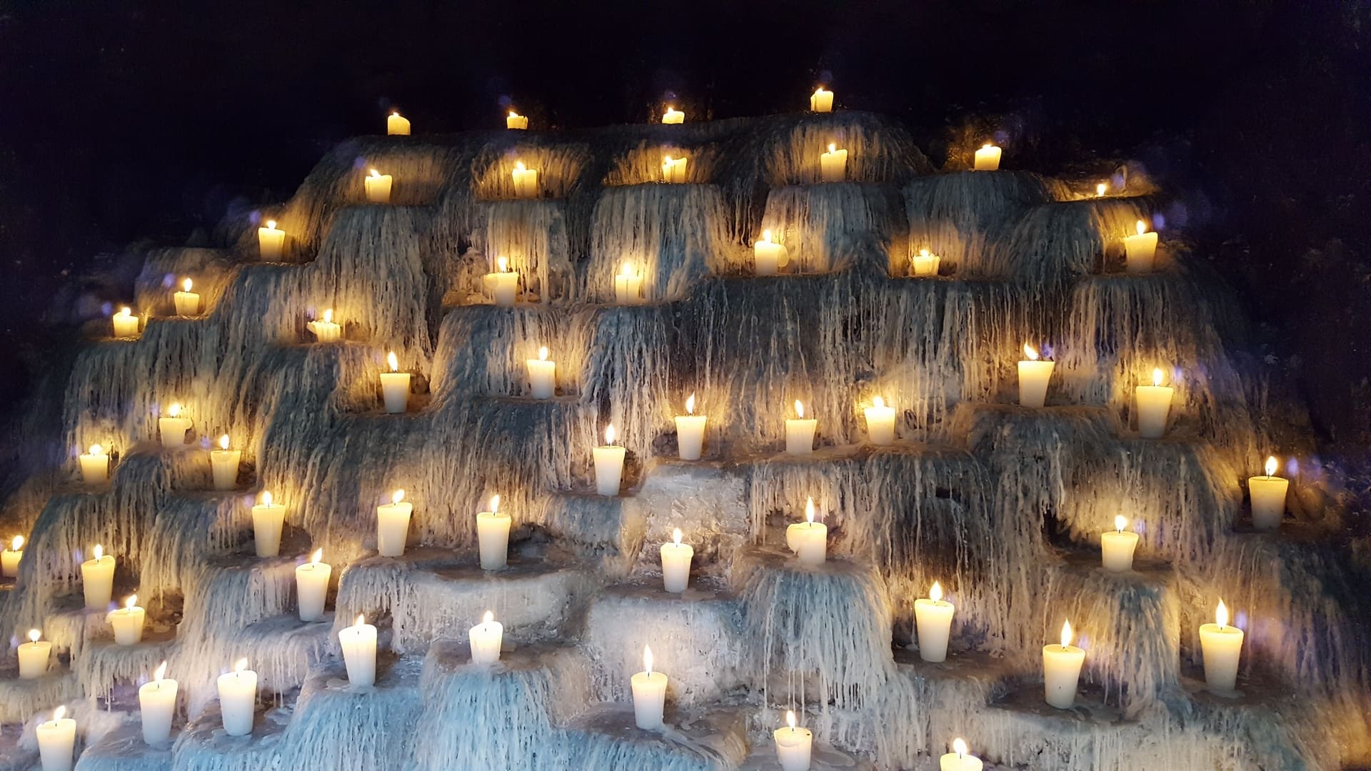 Nous terminons la visite par l’espace de recueillement du cimetière avec un mur de bougies assez original :