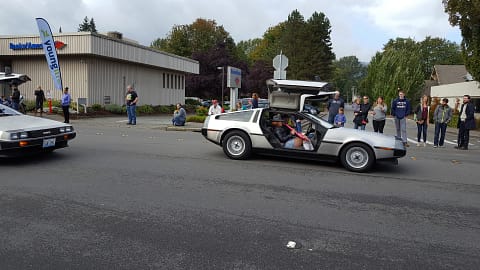Ce qu’il y a de bien dans ces parades, c’est que quasiment n’importe qui peut défiler. Les associations et clubs du coin peuvent choisir de faire partie de la parade. Ce jour là nous avons eu droit au club des propriétaires de Delorean ! Nous avons été servis car il y en avait quelques unes : à commencer par le modèle classique et bien connu du film Retour vers le Futur.