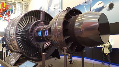 Avant de partir visiter l’usine on peut admirer quelques pièces utilisées dans la construction des avions. Comme ce moteur Rolls Royce proposé aux clients lors de la commande.