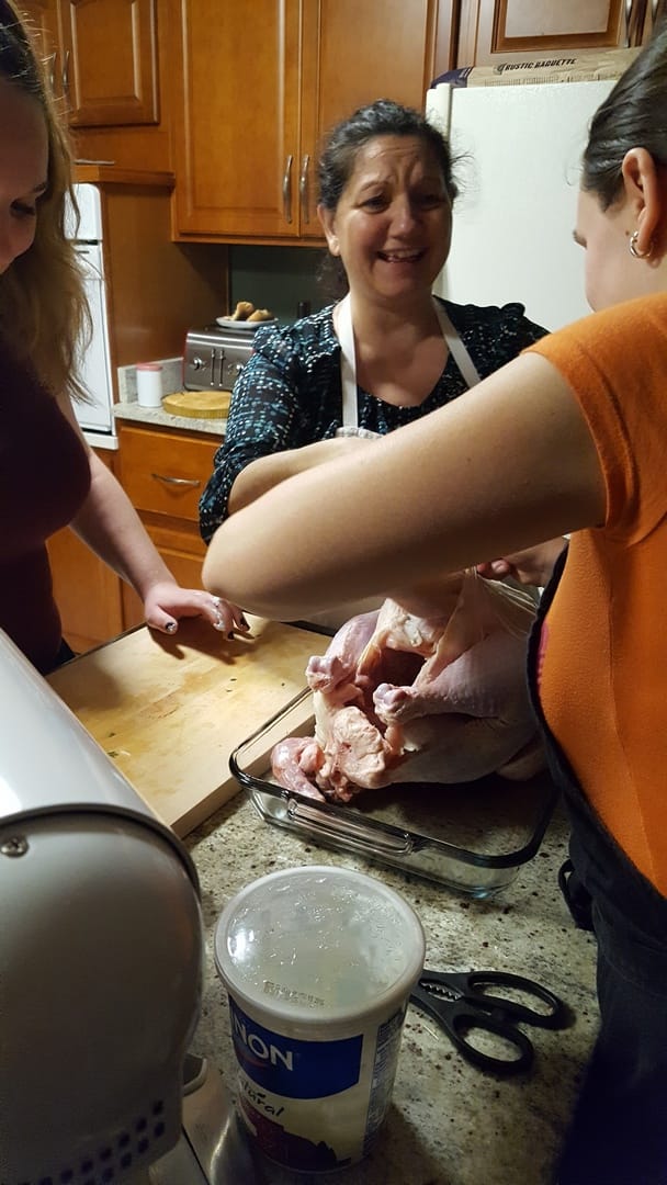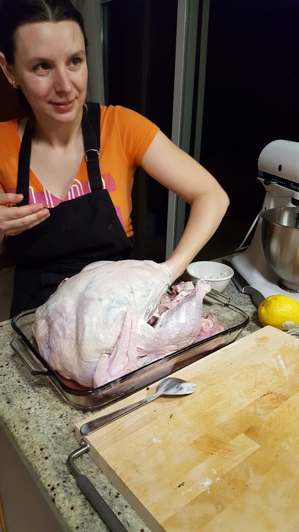 Nous commençons par l’enduire de crème et herbes variées, thym, romarin… Un exercice un peu spécial pour nous qui n’avons jamais préparé de dinde entière, en fait !! Je me mets à la manœuvre, je ne sais pas trop ce que je fais mais l’essentiel c’est d’en rire, non ?!