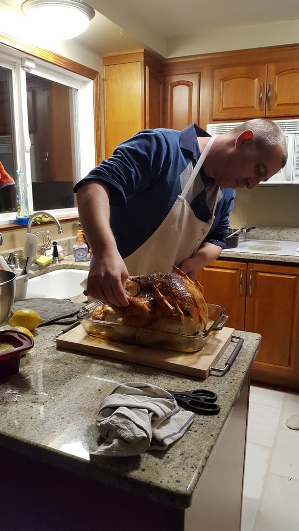 Entre temps il faut s’occuper de la dinde, la sortir du four, la retourner et l’arroser pour ne pas qu’elle sèche. Et pour ça on a besoin de Thomas, parce qu’elle pèse son poids la bête :