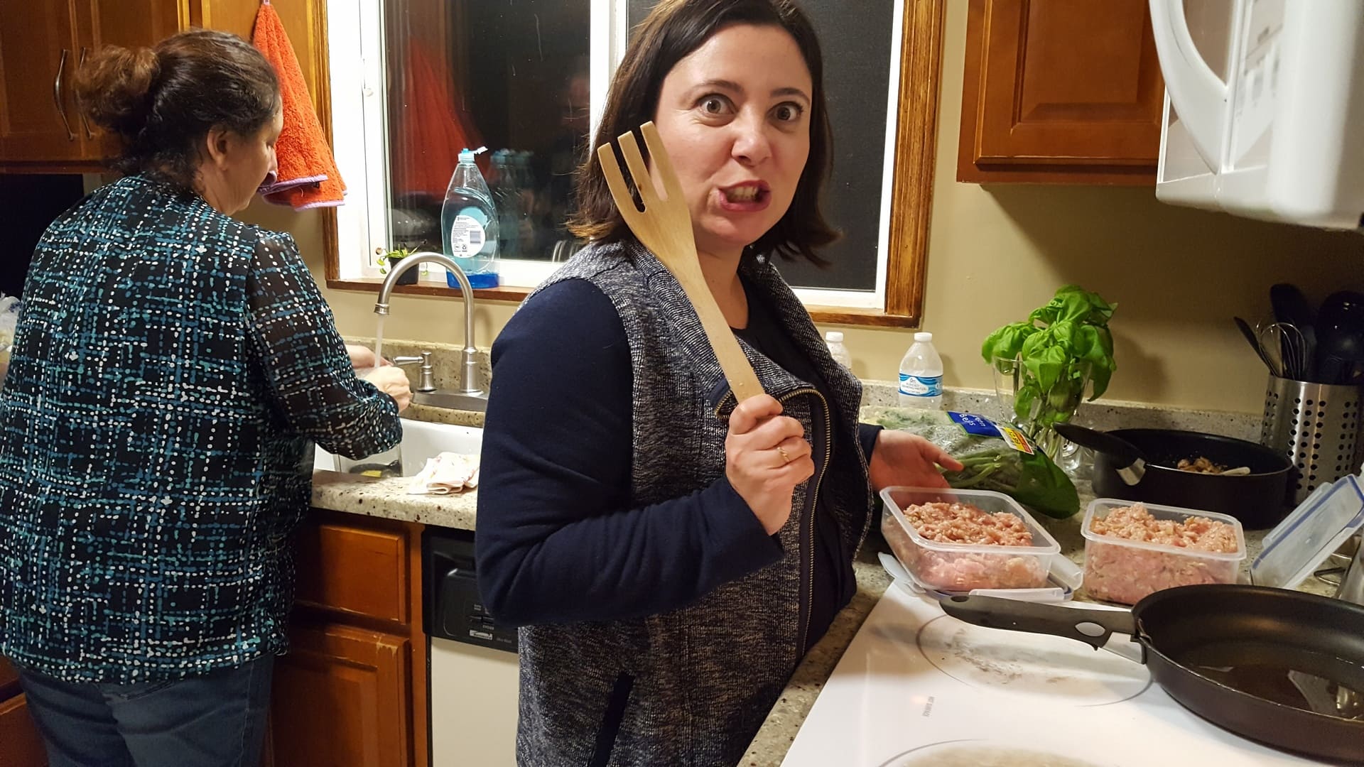 Une petite goutte de Pouilly Fuissé et ça repart ! Il ne reste plus qu’à s’occuper de la farce pour la dinde, et nous serons fin prêtes. Comme ça fait plaisir à Manu on la laisse faire :
