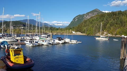 Après quelques heures de route, nous arrivons à Squamish. Le soleil est au rendez-vous : le petit port qui donne sur la montagne est magnifique.
