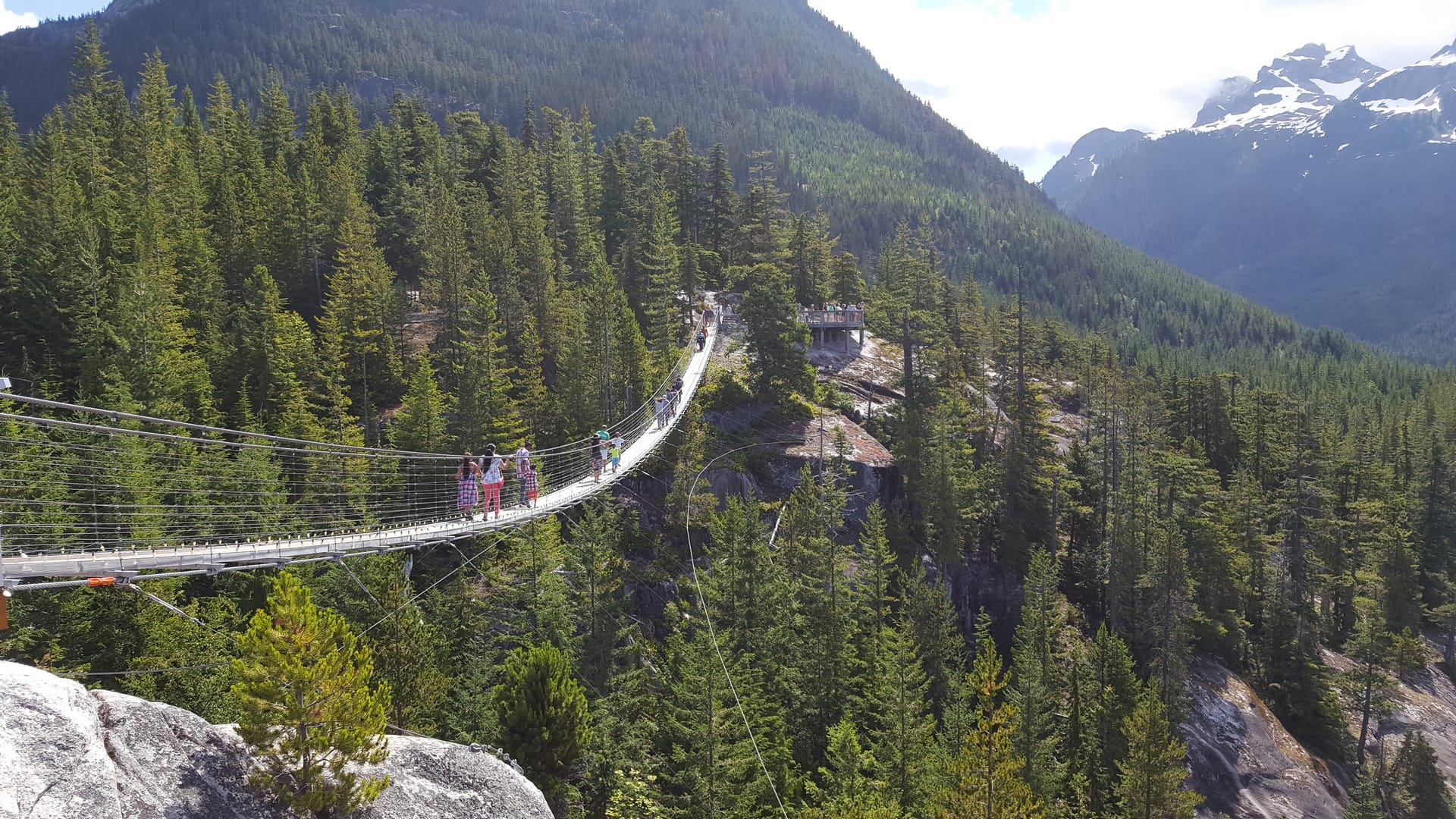 Mesurant plus de 100 mètres de long, ce pont est suspendu entre les 2 montagnes principales. C’est l’activité à faire quand on vient à Squamish. Juste le fait de regarder Oscar et Rodolphe traverser me donne des sueurs froides. J’attend donc sagement qu’ils reviennent en admirant la vue.