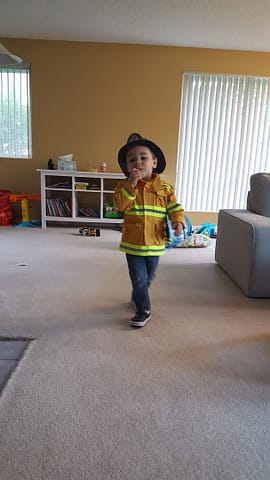 Oscar en profite pour jouer et redécouvrir des jeux qu’il avait oubliés, comme son déguisement de pompier.